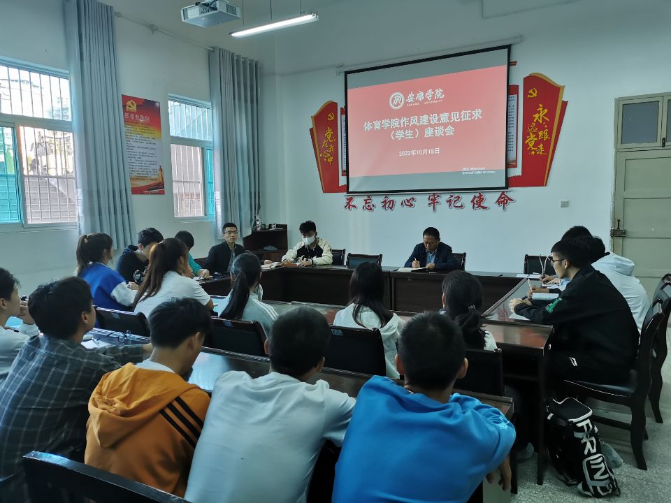 10月19日,贝博官网在体育馆一楼会议室召开作风建设意见征求学生座谈会,学院党总支书记高立平、学工办副主任王立、团总支书记康梦瑶以及各班学生代表参加了座谈。