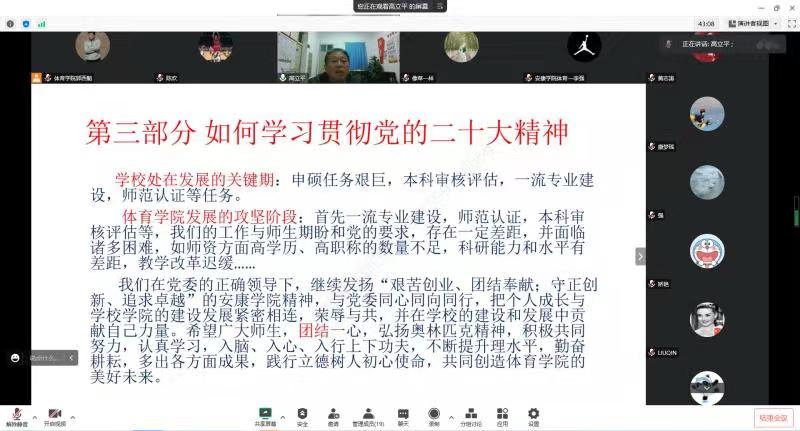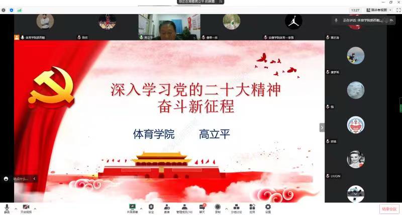本次工会活动运用“腾讯会议”软件以线上形式开展,邀请BB贝博艾弗森官网党总支书记高立平同志为BB贝博艾弗森官网全体教师作了题为《深入学习党的二十大精神—奋斗新征程》的主题报告,从党的二十大召开概况;党的二十大的主要精神和如何贯彻党的二十大精神等三个方面进行了宣讲。