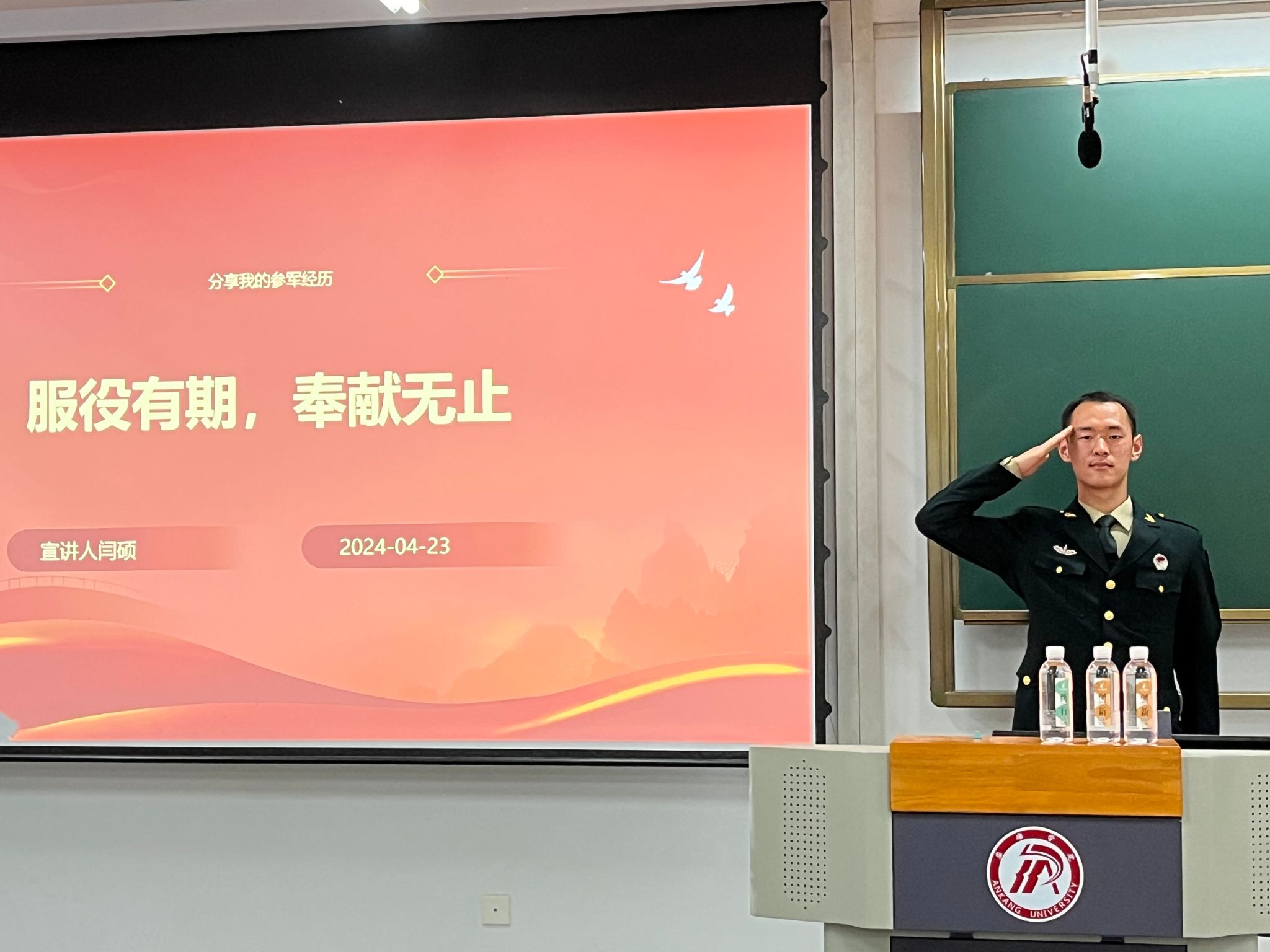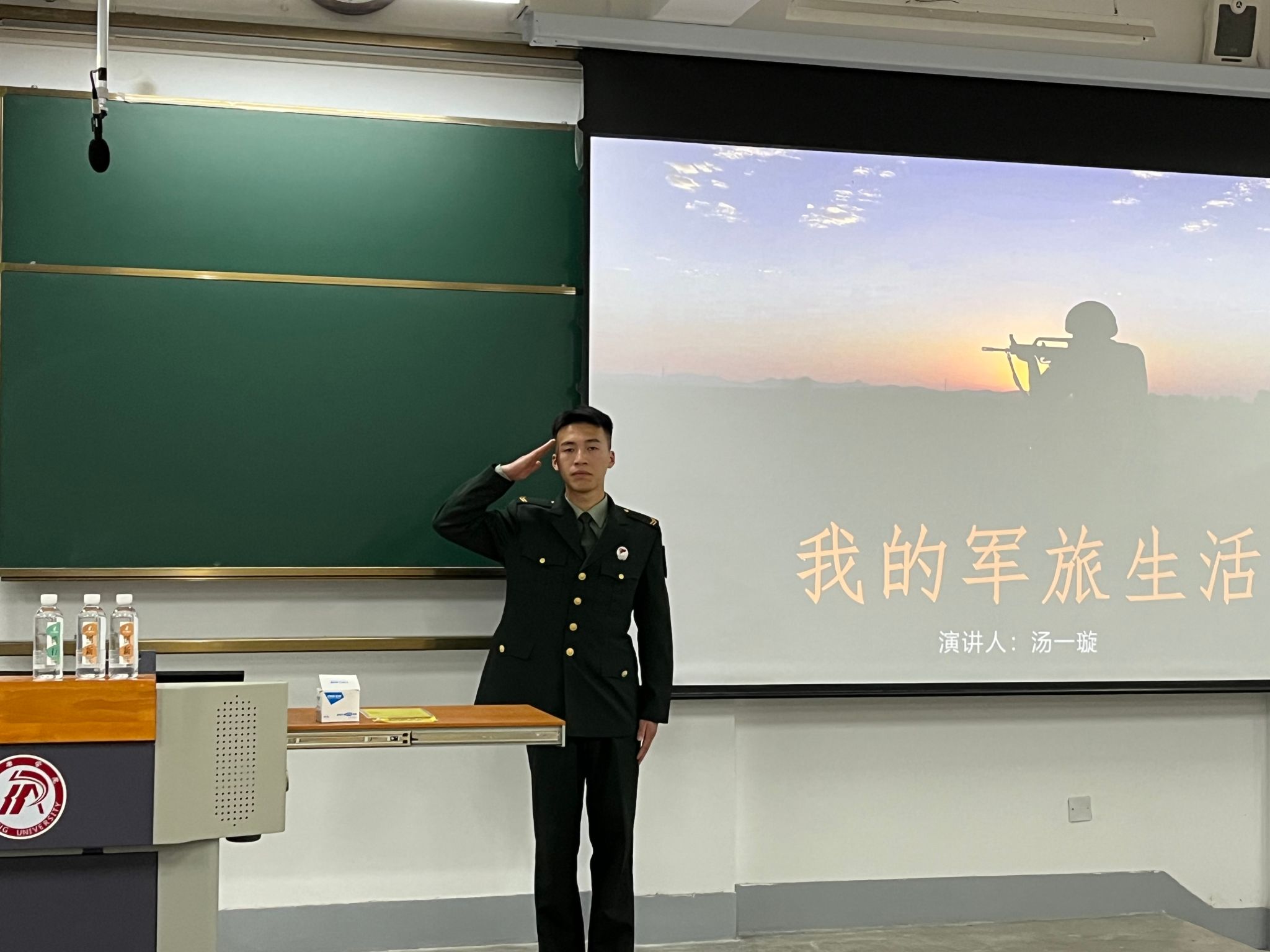 随后,我院特邀退伍军人2023级学生闫硕、汤一璇同学进行“服役有期,奉献无止”“我的军旅生活”事迹分享,他们从部队训练、执行任务、军营生活、军人待遇等方面做了详细介绍。他们勉励同学们,不要把生命献给无知、平庸和低俗,要把自己的前途和命运同国家和人民的需要结合起来,成为敢奋斗、敢担当的最可爱的人。