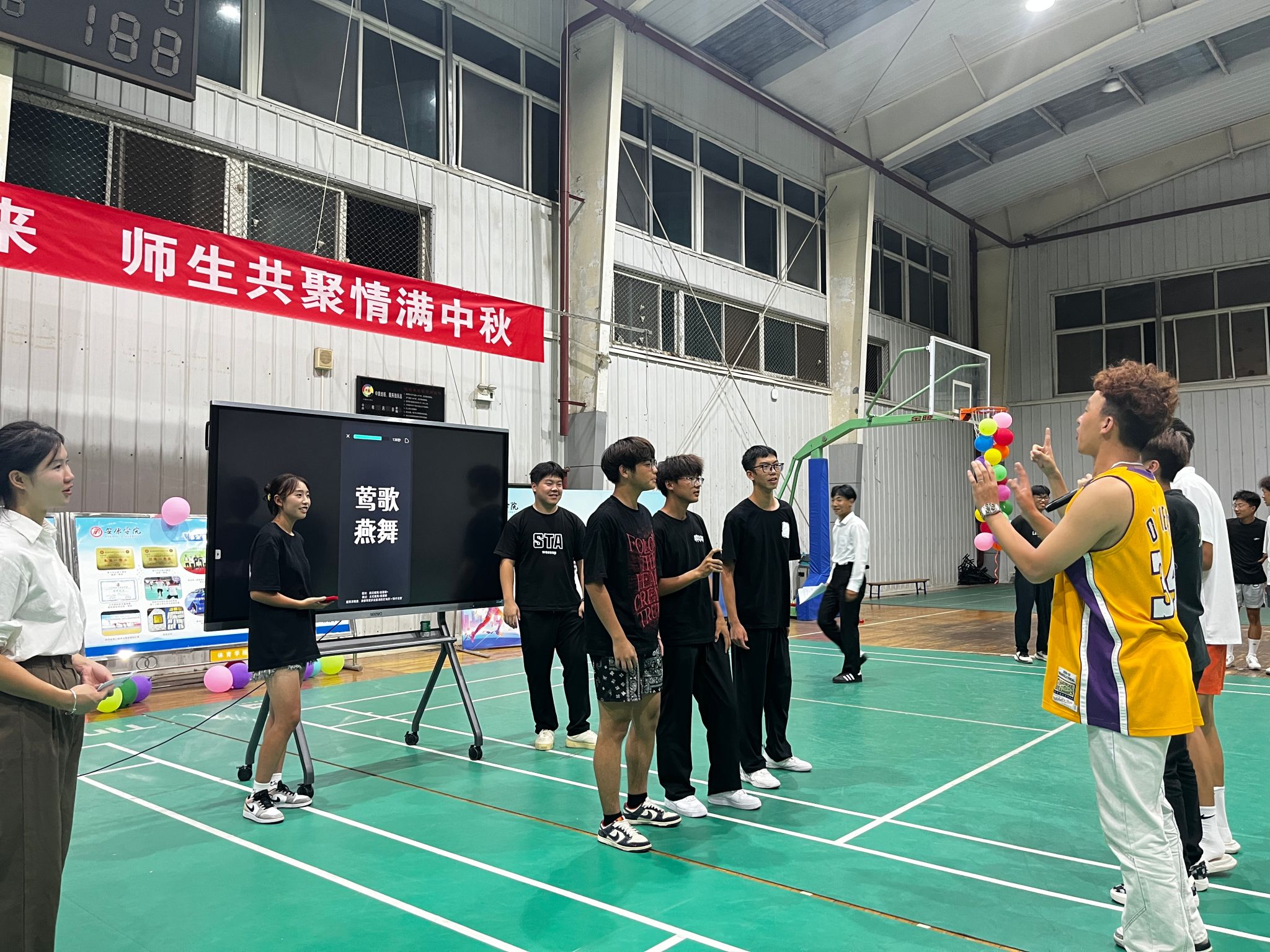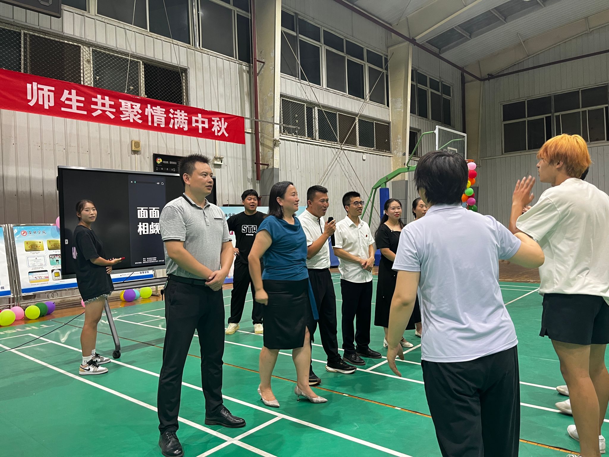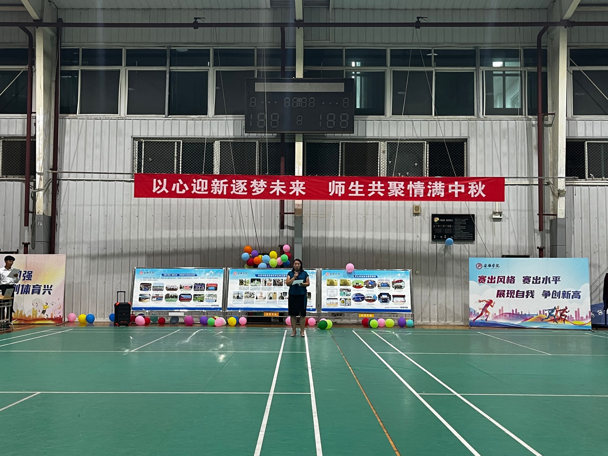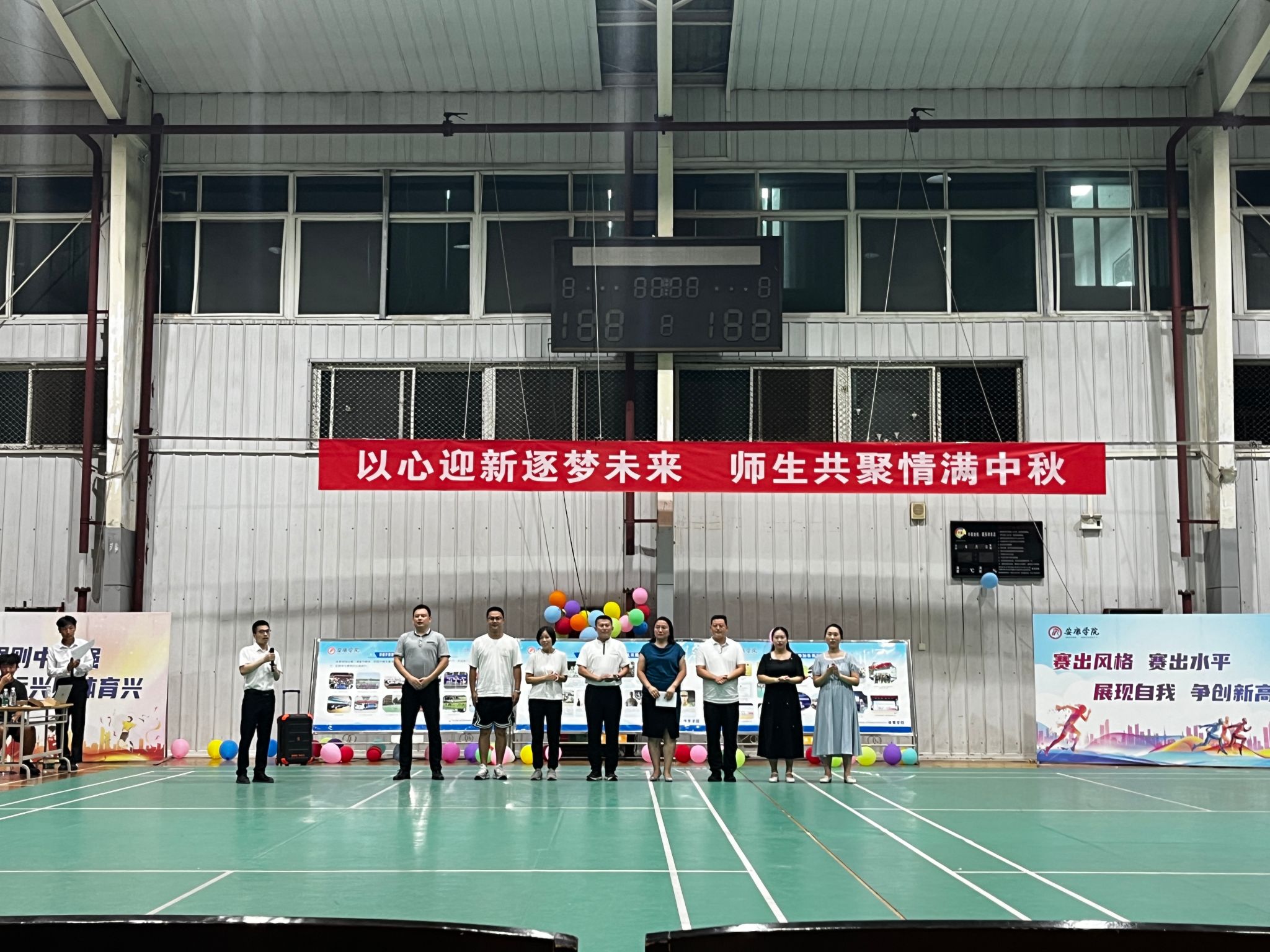 9月14日晚,贝博官网在江南校区体育馆2楼举办“以心迎新逐梦未来· 师生共聚情满中秋”2024年迎新晚会。院长吕仙利,党总支副书记郭西魁、工会分会主席马玉琴、体育系主任廖建发、实验教学中心主任刘芹、大学体育教研室主任赵娇艳、党政办公室主任陈欢、学工办主任王立、团总支书记王毅、新生辅导员院柯等参加了本次迎新晚会 。